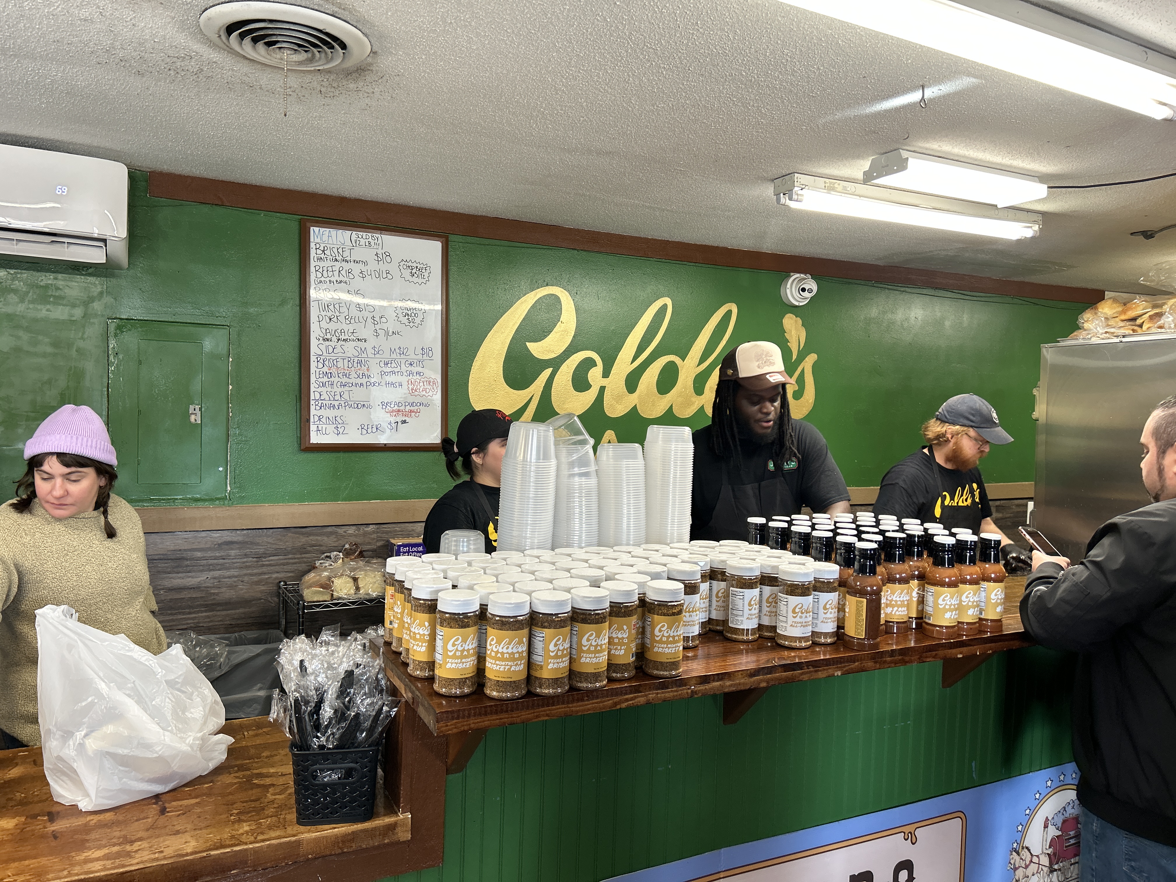 We left my house just after 7am to grab our buddy and we ended up arriving at Goldee’s just after 8am. Which I will recommend as the perfect time on a Saturday morning to arrive. There were a good 30-40 people ahead of us but no fear of anything being sold out with our location in line. I was surprised to see a pile of lawn chairs available for folks who did not show up with their own which is a lovely service. Now out of the 100 in the pile, I bet only 4 were still operable, but they are technically still chairs. My advice is to bring your own like we did and pack a cooler with water and beer. Because life-changing brisket hits different when you sit in a lawn chair with some breakfast beers and good company.