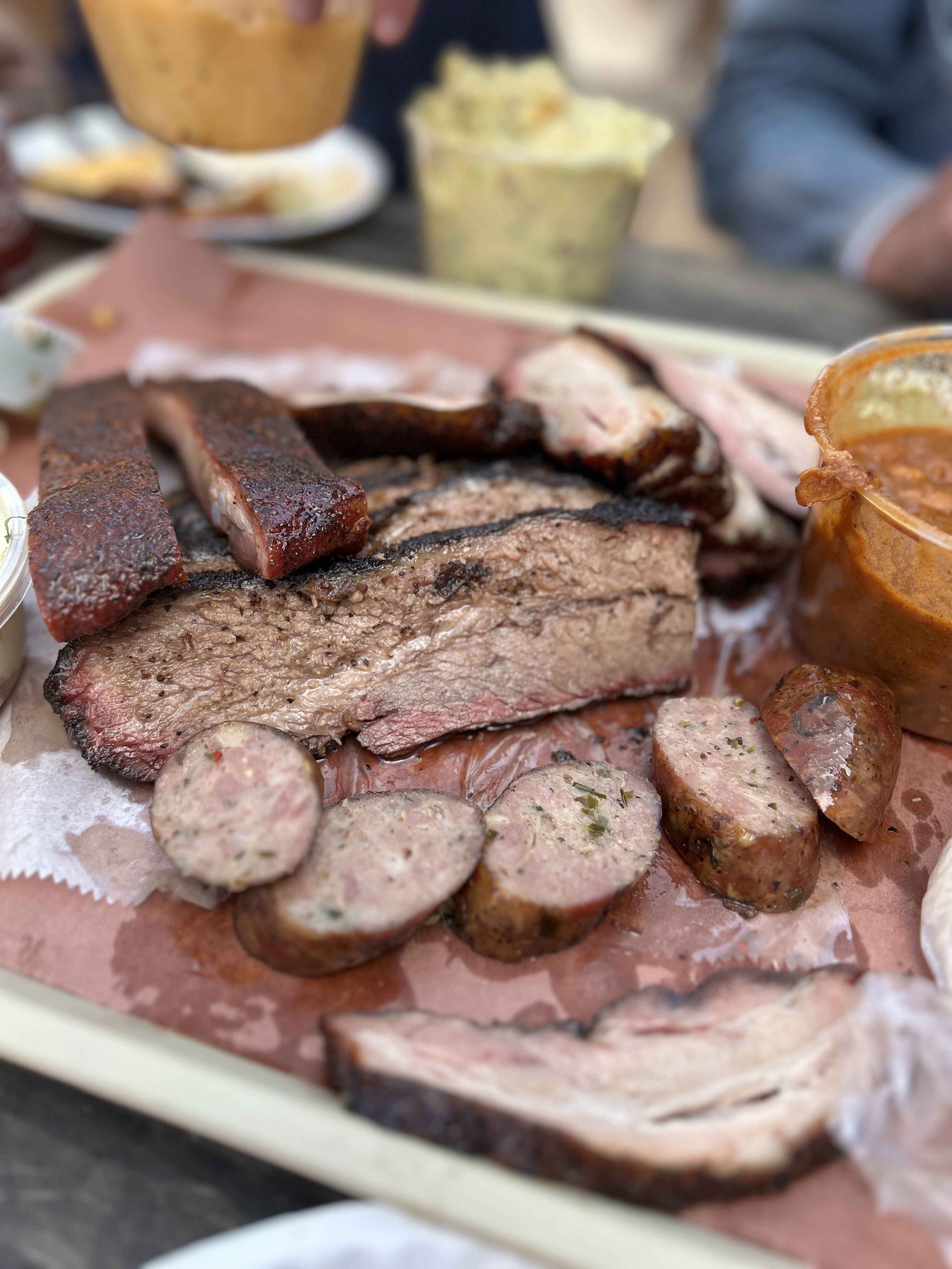 The accolades earned by Goldee’s from Texas Monthly and Michelin are completely deserved. They have one of the best pork ribs that I’ve ever had. The rub was sweet and the meat was tender. Pork Belly, which is not typical on a BBQ menu, was outstanding but I believe that they could have gone crispier but that’s just me. We had a spirited debate as we got into the trailer about the proper way to pronounce “Laotion” which we all agreed is a weird way to say “something from Laos”. After we learned from Google the correct pronunciation we grabbed a Laotion sausage link out of spite and it was worth it, fantastic. We avoided the turkey and sausage but the group in front of us had high praise for the turkey. Now the brisket, oh that brisket. I am a fatty slice believer but they made an effort to make sure everyone gets half fatty and half lean. That was the best lean I’ve had. Perfect chew, wasn’t dry, added with their house BBQ sauce was fantastic. The sides were delicious as well, grab the slaw, tater salad, beans, and cheesy grits, and eat every slice of bread. They make it in-house and it was incredible.